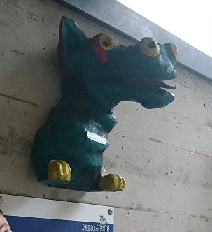 enseñamos la escultura de la cabeza del dragón que hay en la entrada.